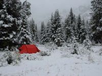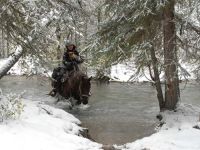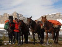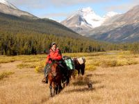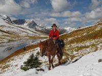 Aufgrund des vielen Schnees, wollten wir unsere Reise rund 150 km südlich des Kakwa Lades abbrechen und über den Bess Pass zu einer Forststrasse absteigen. Wir verbrachten einen frustrierenden, regnerischen Tag damit, einen Weg hinab zu suchen, doch wir blieben auf halber Höhe stecken und mußten wieder umkehren. Wir nahmen es als Zeichen, dass wir weitergehen sollen. In den nächsten zwei Wochen waren wir für dieses Zeichen immer wieder sehr dankbar, denn wir ritten durch absolut einmalige Landschaft. Die ersten drei Tage waren allerdings eine Herausforderung, denn entlang des Jackpine Rivers gab es keinen Trail, und wir mußten uns unseren Weg durch Sumpf und Wald selbst suchen, dabei überquersten wir den Fluss bis zu 20 mal pro Tag. Arme Leni, sie musste immer wieder schwimmen. Am dritten Morgen mußten wir feststellen, dass der Fluss über Nacht wegen starker Regenfälle um einen Meter angestiegen war, ein Glück, dass wir bereits auf der richtigen Seite des Flusses waren und ihn nicht mehr überqueren mußten. Als wir das schwierige Flußtal verließen kam auch der Sommer zurück in die Berge. Wir ritten durch alpine Hochgebirgslandschaft mit herrlicher Aussicht über schneebedeckte Berge. Hin und wieder hatten wir unsere Schwierigkeiten den richtigen Weg zu finden, denn er verlor sich immer wieder in sumpfigen Wiesen. Doch damit wird uns garantiert nie langweilig. Auf einer Lichtung entdeckten wir eine Herde Caribous. Weder wir noch die Pferde hatten jemals zuvor Caribous gesehen, und starrten sie fasziniert an. Anfang Oktober kamen wir am Kakwa Lake an und folgten der Forststrasse bis zur ersten Ranch.