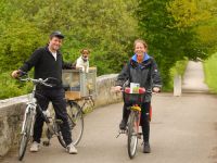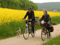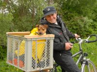 Zum Aufwärmen und als kleines Konditionstraining beschlossen wir diesmal nicht mit dem Zug nach Deutschland zu fahren, sondern mit dem Fahrrad. Begleitet wurden wir von Günters Schwester Inge, Barbara und Mart. Und natürlich Leni! 90 Kilometer täglich zu laufen wäre auch für unser Engeriebündel zu viel, daher bekam sie einen großen gepolsterten Korb. Und weil's so kalt war, eine weiche Fleecedecke zum Einwickeln.