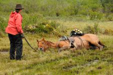 Ein Sturm fegte über uns hinweg, dass ich mich am Sattelhorn festklammerte, um nicht vom Pferd geweht zu werden. „Wie in Patagonien!“, rief Günter. War das nun Zufall, dass die Reise endete wie sie begann: mit stürmischem Wind? Ich konnte es nicht mehr abwarten endlich über den Bergrücken zu gelangen, denn auf der anderen Seite konnten wir mit Windschatten rechen, außerdem sollten wir von oben unser Ziel, das Dörfchen Healy, bereits erkennen können. Leichter Regen hatte sich zum Wind gesellt und machte das Unterwegssein ungemütlich. Wir kämpften uns vorwärts, überschritten den Grat und … waren sprachlos. Vor uns lag Healy, umrahmt von einem Regenbogen. Wir hielten inne, gebannt von dem Naturschauspiel. „Willkommen am Ziel“, flüsterte ich ehrfurchtsvoll, denn es war kein Moment lauter Worte.