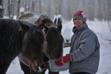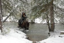 Im Herbst kamen wir in dem alten Goldgräberstädtchen Dawson City nahe der Grenze zu Alaska an. Den Winter verbrachten wir um Yukon. Die Pferde und wir mussten mit Temparturen von bis zu -40 Grad C zurecht kommen. Dafür wurden wir mit einer herrlichen Winterlandschaft und viel Sonnenschein belohnt, und unsere Pferde waren auf einer riesigen Koppel und durften soviel Heu fressen, wie sie nur wollten. Einige Wochen des Winters verbrachten wir in einer abgelegenen Trapper-Hütte mitten in der Wildnis. Ein einmaliges Erlebnis!