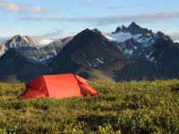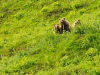 Weglos unterwegs zu sein bedeutet auch, dass einer von uns immer wieder abends auf einen Aussichtspunkte klettert, um die beste Route für den nächsten Tag zu suchen. Bei einem dieser Ausflüge entdecke ich eine Grizzlybärin mit zwei Jungen. Sie grasen am Fuße des Passes, den ich erkunden soll. Ich rufe Leni zu mir und warte, bis mich die Bärin sieht. Sie stelle sich auf die Hinterbeine, sieht mich kurz an, und klettert spielerisch leicht den steilen Hang hinauf, gefolgt von den drolligen Bärenjungen.